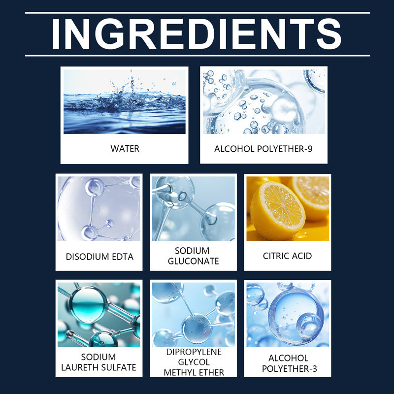 Ingredientes del producto: Agua, Alcohol Poliéter-9, Edetato de Disodio, Ácido Cítrico, Lauril Éter Sulfato de Sodio, Metil Éter de Dipropilenglicol, Alcohol Poliéter-3